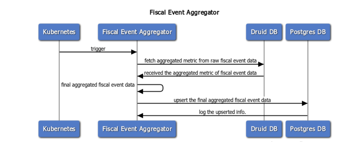 Fiscal Event Aggregator is a Java standalone application that runs as a Cron Job to aggregate fiscal event data from the Druid data store to Postgres DB.